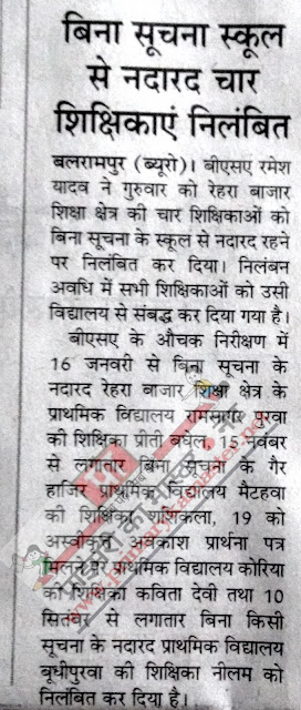 बलरामपुर : विना सूचना के स्कूल से नदारद चार शिक्षिकाएं निलंबित