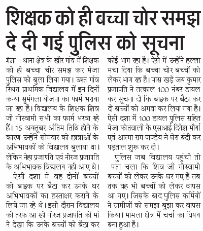 प्राथमिक विद्यालय के शिक्षक को ही बच्चा चोर समझ दे दी गई पुलिस को सूचना