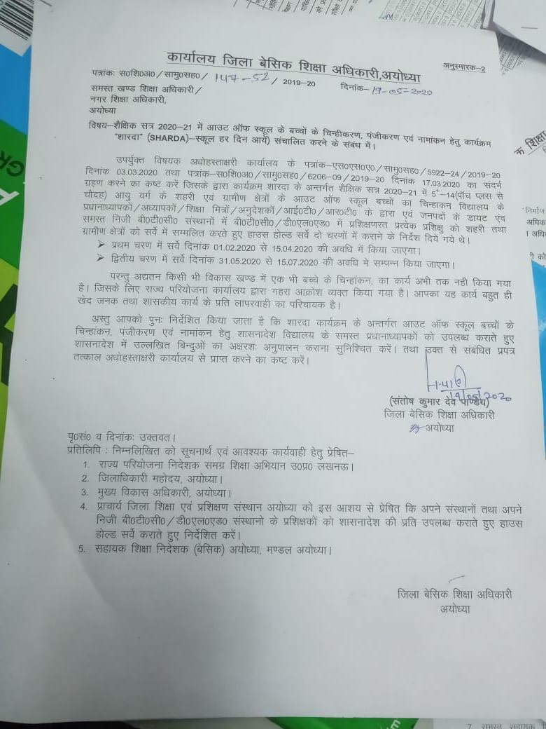 अयोध्या : शैक्षिक सत्र 2020-21 में आउट आफ स्कूल के बच्चों के चिन्हीकरण, पंजीकरण एवं नामांकन हेतु शारदा (स्कूल हर दिन आए) संचालित करने के संबंध में